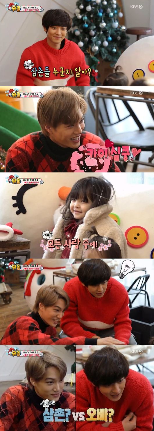 23일 오후 방송된 KBS2 '해피선데이-슈퍼맨이 돌아왔다'에서는 엑소의 카이, 찬열 삼촌과 만난 나은이와 건후의 모습이 그려졌다.