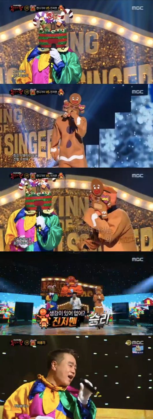 이 대결의 승자는 진저맨이었다. 진저맨은 2라운드로 진출했고, 캔디가이는 김현식의 ‘사랑했어요’를 열창하며 복면을 벗었다. 그의 정체는 놀랍게도 배우 이광기였다. 김구라는 “난 알았다”며 뿌듯해했다./ yjh0304@osen.co.kr