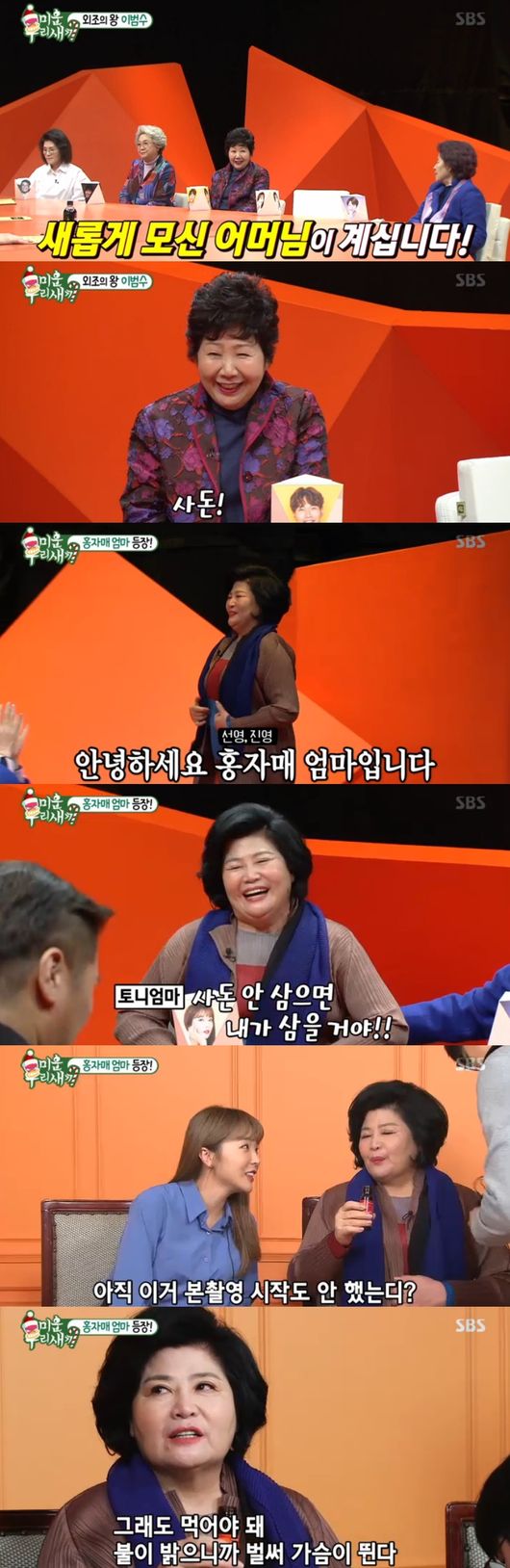 신동엽은 "새롭게 모신 어머니가 있다"고 운을 뗐다. 토니母는 "사돈"이라고 불렀다. 바로 홍진영, 홍선영의 홍자매母 등장이었다. 토니母는 "사돈 안 삼으면 내가 삼을 것"이라며 계속해서 어필해 웃음을 안겼다.