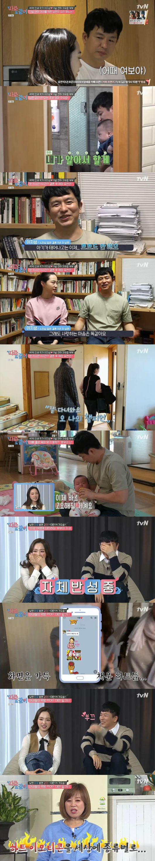 하지만 '따로 또 같이'에서 공개된 이들 부부의 일상은 더없이 달콤하고 평온했다. 4살 딸 한나와 생후 6개월 된 아들 예일을 챙기는 차유람의 아침은 여느 엄마와 다르지 않았지만 이지성은 늦게 잠이 깬 상황에서도 육아를 함께하며 아내를 도왔다.