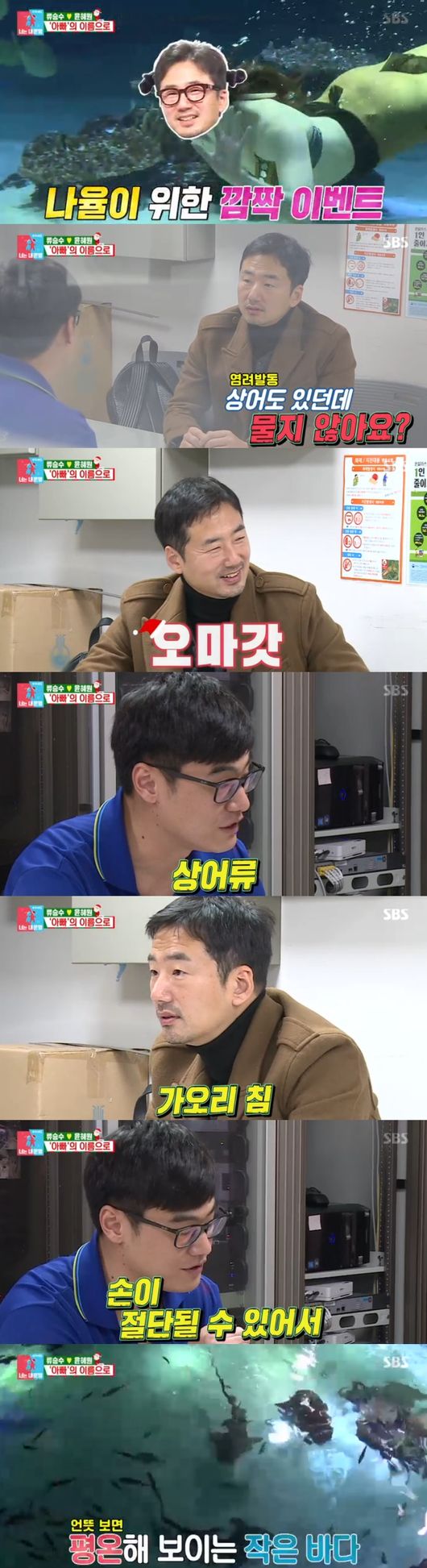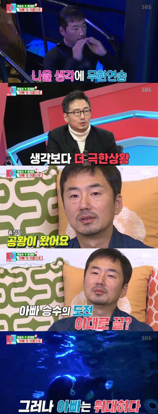 류승수, 윤혜원 부부가 그려졌다. 류승수는 요즘 딸이 인어공주 얘기를 자주 한다며 '인어왕자'로 변신해 딸을 위한 특급 이벤트를 준비했다. 류승수는 용기를 내서 잠수를 시도했다. 발 밑으로 상어가 가득해 긴장감을 더했다. 생각보다 더 극한 상황, 하지만 류승수는 오로지 딸을 생각하며 다시 잠수를 시도했다. 전문가 격려에 용기를 냈으나, 상어와 마주치고 말았다. 류승수는 "솔직히 공황이 왔다"면서 급기야 신경 안정제를 복용했다. 긴장감 넘치는 아빠 승수의 도전이었다.