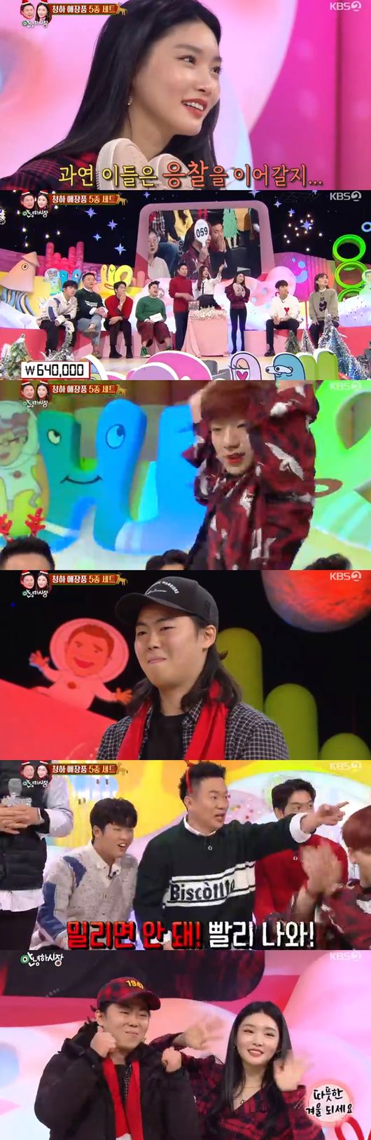 청하의 애장품. 롱패딩과 신발. 여기에 모자, 티, CD까지 총 5종세트가 완성됐다. 청하 팬 3명이 최후까지 격돌했다. 64만원까지 금액이 올라갔고 신동엽이 세 명 모두 무대로 올라오라고 해서 댄스로 승패를 가리자고 했다. 청하 팬들의 댄스와 노래 대결이 시작됐다. 청하가 선택한 사람은 43번이었다. 64만원을 기부했다.
