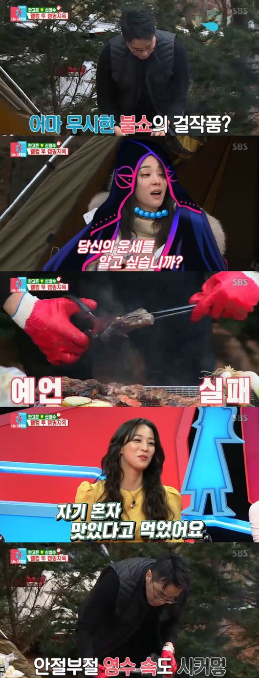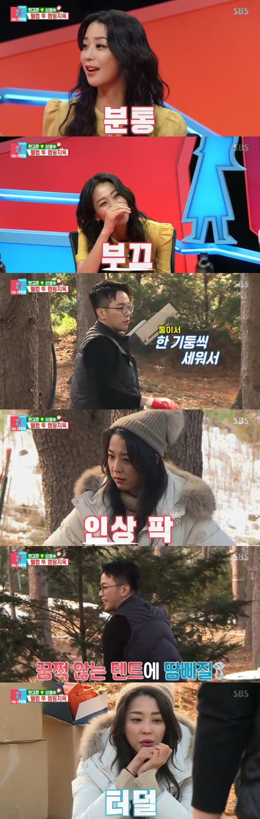 바로 버킷리스트였던 겨울캠핑을 떠나기 위한 것들이었던 것. 하지만 집에 있는 것과 중복된 것들을 새로 산 모습에 한고은이 식겁한 모습을 보였다. 필요한 것만 샀다고 했으나, 영수증을 확인한 후 한고은은 깜짝 놀랐다. 장비 지름신으로 또 다시 많은 장비를 사고 만 것이었다. 한고은은 애견텐트까지 산 영수에게 직접 텐트치는 법을 연습해보라고 했다. 하지만 제자리걸음 뿐이었다. 보다못한 고은이 이를 도왔다. 민망해진 영수는 "재밌는 건데 양보한다"고 말해 웃음을 안겼다. 한고은은 설명서도 보지않고 뚝딱 텐트를 쳤다. 맥가이버 수준이었다. 5분도 되지 않아 강아지 텐트를 완성했다. 한고은은 "우리 텐트도 내가 쳐야되는 거 아니냐"며 걱정했다.