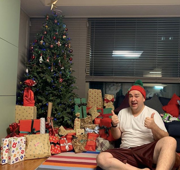 샘 해밍턴은 "올해 크리스마스 너무 설렌다. 윌리엄 하고 벤틀리 반응 진짜 궁금하네"라고 크리스마스 트리 밑 잔뜩 쌓인 선물과 함께 함박 미소를 지은 모습.