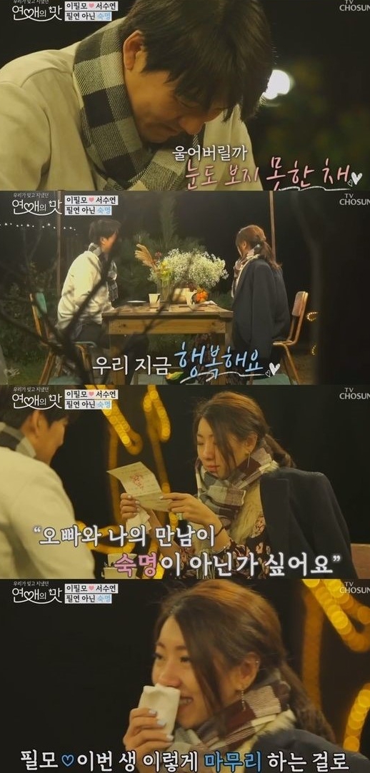 시청자들마저 헷갈릴 정도로 두 사람의 마음은 진심처럼 보였다. 이유는 실제로 두 사람이 결혼을 전제로 방송을 넘어선 감정을 나누고 있었기 때문. 이날 방송에서 서수연은 이필모만을 위한 이벤트를 준비했고, 감동한 이필모는 답가를 선사했다. 서수연은 이필모의 노래에 감동받아 눈물을 뚝뚝 흘렸고, 이필모 역시 눈시울을 붉혔다. 마지막 편지에서 서수연은 "우리의 만남이 진짜 필연일지 아닐지 모르지만 앞으로가 더 기대된다. 방송으로 만났지만, 카메라 밖에서도 오빠랑 즐겁게 만나고 싶다"고 말했고, 이필모는 서수연을 향해 "이번 생은 이렇게 마무리 하는 걸로"라고 화답했다.