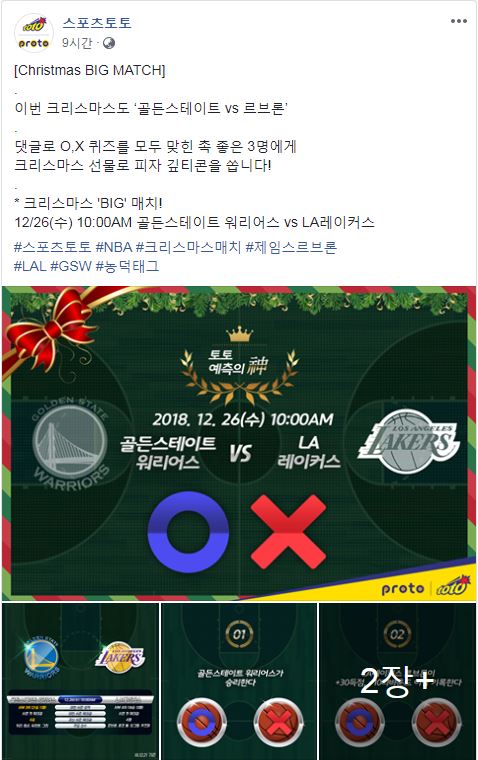 체육진흥투표권 스포츠토토의 수탁사업자인 ㈜케이토토(www.ktoto.co.kr)가 공식 페이스북(www.facebook.com/sportstoto.toto.proto)을 통해 NBA 화제의 경기를 대상으로 결과를 맞히는 크리스마스 빅매치 이벤트 ‘토토 예측의 신’을 진행한다.
