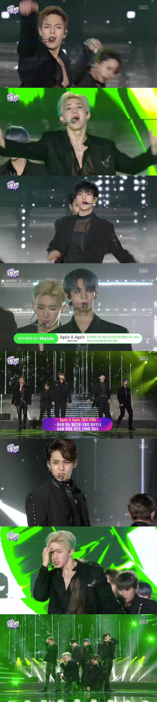 이날 몬스타엑스의 셔누와 원호, 세븐틴의 호시와 민규, 워너원의 우진과 진영이 선배 아이돌인 2PM의 히트곡 ‘어게인 & 어게인’ 퍼포먼스와 노래를 선보였다.
