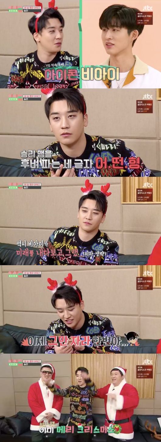 승리는 “여러 후배들이 나왔는데도 내가 형 덕분에, 빅뱅의 간판을 달고 1위를 하게 됐다. 감사하다. 씩씩하고 건강하게 군생활 했으면 좋겠다”고 형들에게 고마움을 전했다. 그렇게 빅뱅 형들을 그리워한 승리. 그는 YG 후배들의 소홀함을 섭섭해하기도 했다. 승리는 “송민호 전화번호로 전화를 걸었는데 어떤 아주머니께서 ‘요즘 송민호 번호 아니냐고 전화를 하는데 아니다, 확인해보라’고 끊어버렸다. 그래서 송민호에게 왜 번호 바뀐 거 말 안 했냐고 물었다. 그랬더니 ‘요즘 정신적으로 힘들어서’라고 말했다. 정신적으로 힘든 것과 번호 바뀐 거 말하는 건 무슨 관련인 것이냐”고 폭로해 웃음을 자아냈다.