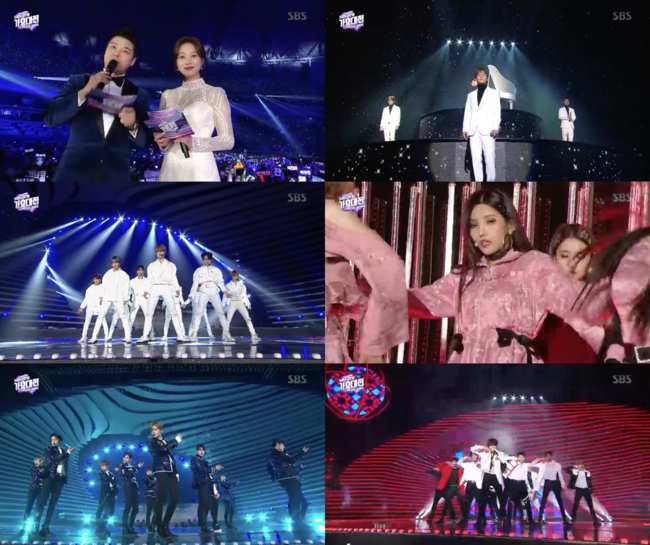 올 한해 아티스트들의 활약상을 한 번에 살펴볼 수 있었다. 여자친구는 ‘여름여름해’를 ‘겨울겨울해’로 개사해 센스 있는 겨울 무대를 선보였다. 세븐틴은 ‘어쩌나’의 색다른 편곡 무대와 ‘콜콜콜’로 시상식의 분위기를 북돋웠다. 몬스타엑스는 특별한 인트로와 함께 ‘슛 아웃’의 강렬한 퍼포먼스를 선보였다.