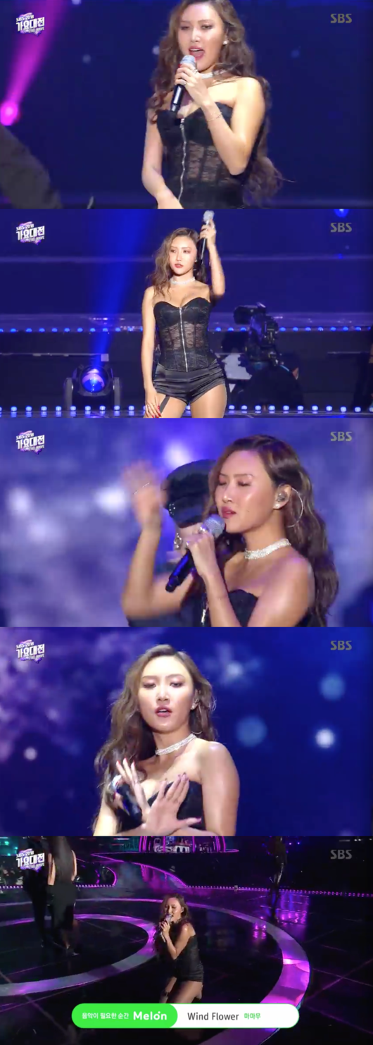 이날 마마무는 과감한 블랙 의상을 입고 무대에 올랐다. 특히 화사의 블랙 란제리 의상이 주목을 받았다. 화사는 멤버들과 함께 '별이 빛나는 밤'과 '윈드 플라워' 무대를 선보였다. 가창력과 퍼포먼스 그리고 무대 의상까지 모든 것이 어우러진 무대로, 화사는 당당한 무대 매너로도 시선을 압도했다.