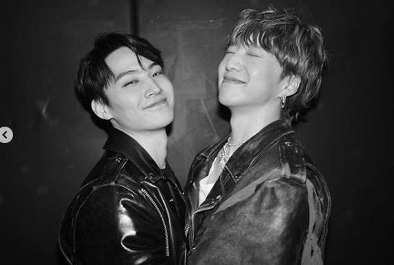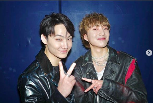 사진 속에는 강승윤과 JB가 함께 다양한 포즈를 취하고 있다. 특히 두 사람의 환한 미소와 훈훈한 외모가 시선을 사로잡는다. 동갑내기인 두 사람은 이날 방송된 SBS '가요대전'에서 만난 것으로 보인다.