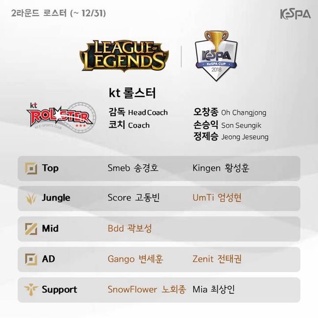 KT는 이번 KeSPA컵 2라운드에서 9인 로스터를 제출했다. '비디디' 곽보성이 버티는 미드를 제외하면 포지션별로 두 명씩 자리를 채우고 있다.
