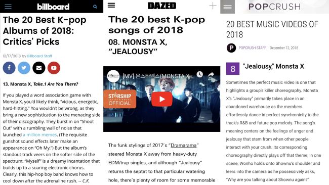 미국의 팝크러시는 K팝 영역이 아니라 팝 전체의 영역에서 몬스타엑스의 선전을 기념했다. 팝크러시는 최근 공개한 '2018 베스트 뮤직비디오 20'에 몬스타엑스의 'Jealousy' 뮤직비디오를 랭크시키며 높은 점수를 부여했다. 매체는 "몬스타엑스가 간과할 수 없는 그룹이라는 것을 증명하는 최고의 뮤직비디오"라며 극찬을 아끼지 않았다.