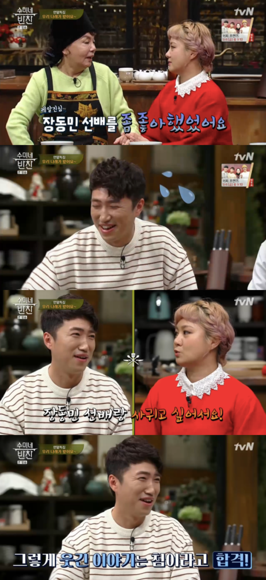 박나래는 26일 방송된 tvN ‘수미네 반찬’에서 “장동민 선배를 좀 좋아했다. 인정하고 싶지 않은데 개그우먼 되기 전에 장동민을 좋아했다”고 밝혔다.