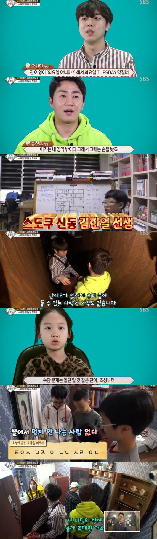외국어천재인 영재 아이는 개미핥기, 메뚜기 등 영어단어까지 모두 알아냈으나 연예인팀은 영어단어에서 막혀 고군분투했다. 결국 힌트를 써서 다음단계로 넘어갔다. 그 사이, 아이들은 10초만에 수학규칙을 찾아내며 더 빠르게 속력을 냈다. 영재들은 문제를 잘 푸는 비법에 대해 "생각을 비우는 법"이라고 말해 눈길을 끌었다.