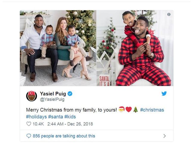 푸이그는 26일(한국시간) 크리스마스 트리를 배경으로 아내, 두 아들과 함께 찍은 가족 사진을 SNS에 올리며 '메리 크리스마스' 인사말을 첨부했다. 또 한 장의 사진을 같이 올렸는데, 잠옷을 연상케 하는 검은 체크무늬가 들어간 붉은 색의 옷을 큰 아들과 함께 찍은 사진이었다.