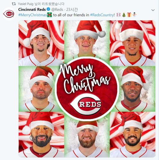 LA 다저스에서 신시내티 레즈로 트레이드된 야시엘 푸이그가 자신의 SNS를 통해 크리스마스 인사를 전했다. 블루(다저스 컬러) 대신 레드(신시내티 컬러) 색깔의 옷을 입고 팬들에게 인사했다.