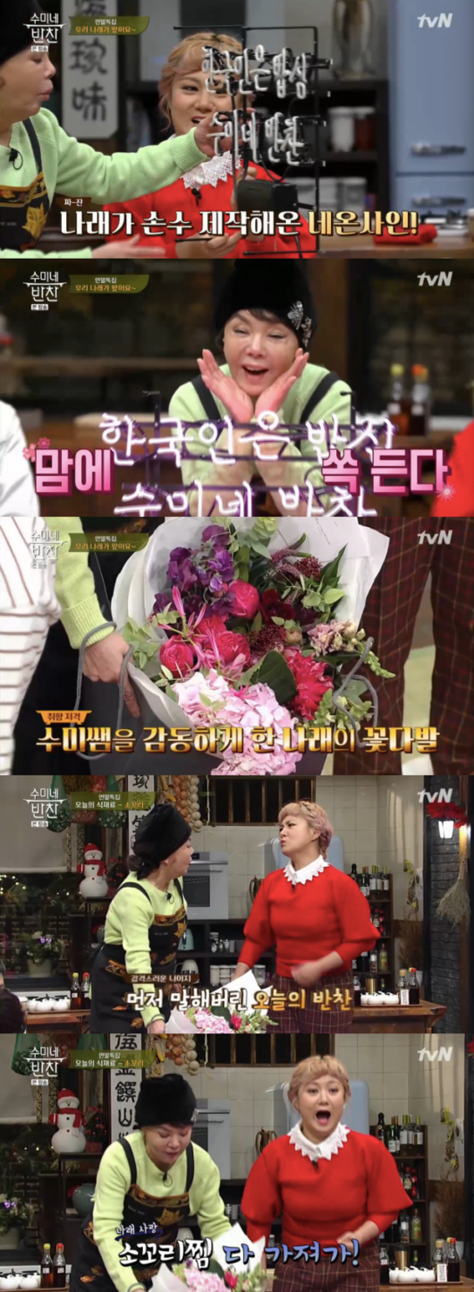 지난 26일 방송된 tvN ‘수미네 반찬’에 박나래가 게스트로 출연했다. 박나래는 평소 '수미네 반찬' 애청자라며 “여기가 맛집이라고 해서 밥 얻어먹으러 왔다”라고 너스레를 떨었다.