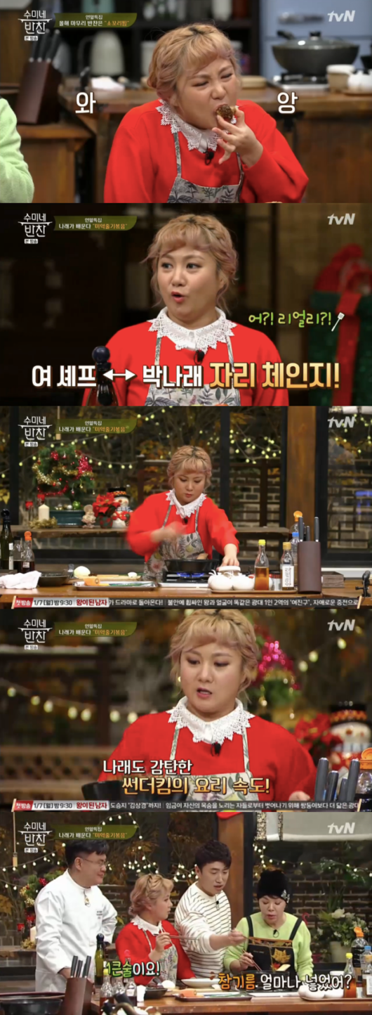 처음부터 센스를 보여준 박나래는 김수미, 장동민과 찰떡 호흡을 보여주는가 하면 맛깔나는 입담으로 웃음을 선사하고 잘 알려진 대로 야무진 요리 실력으로 직접 음식을 만들기까지 했다.