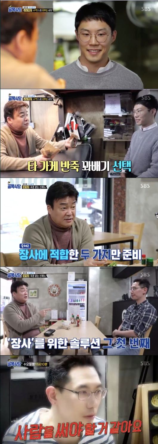 차례대로 맛을 본 백종원은 반죽의 완성도가 떨어진다고 지적했다. 백종원은 “제가 볼 때 사장님 꿈이 횟집, 당구장, 빌딩 지어서 사는 꿈은 좋다. 꿈은 좋다. 잘못하면 이런 그림이 허세로 보인다. 그 꿈까지 허세로 보일 수 있다”며 “외식업은 발품 팔아야 한다. 사장님에게 충고하고 싶지만 밖으로 다니며 물어보고 반죽에 대해서도 물어야 한다”라고 말했다.