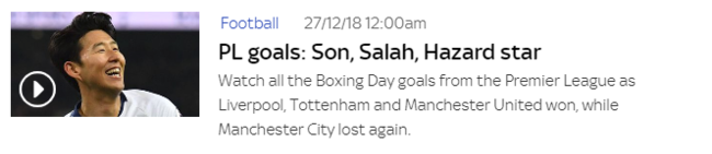 영국 '스카이스포츠는 EPL 19라운드를 요약하면서 손흥민, 모하메드 살라, 에뎅 아자르의 활약과 골장면에 예의주시해서 보도했다.