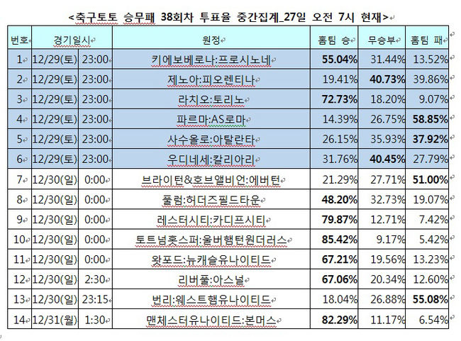 EPL 및 세리에 14경기 대상 축구토토 승무패 38회차 투표율 중간집계 결과