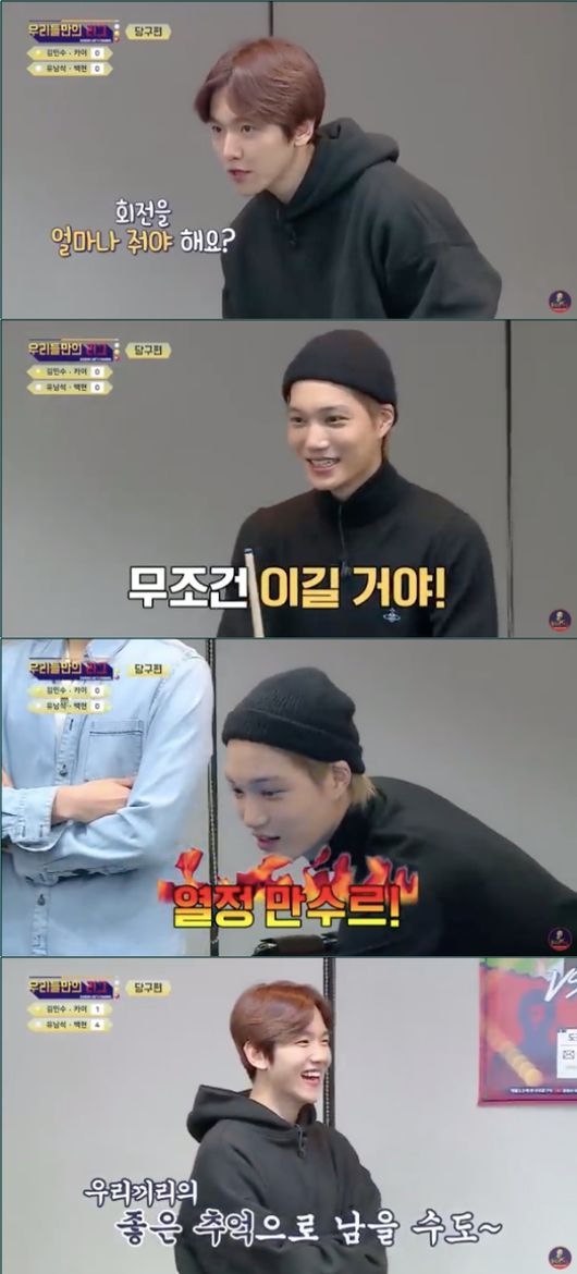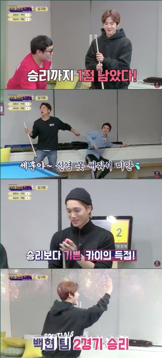남다른 승부욕의 소유자로 알려진 엑소 멤버들은 당구 대결에서도 열정을 불태우며 긴장감을 형성했다. 특히 카이는 매 순간 진지한 면모를 보여주며 경기에 임해 ‘열정 만수르’라는 별명을 얻었다. 이에 카이는 어렵사리 1점을 얻자 승리를 한 것보다 더 기쁘게 환호성을 내질렀다. 그러면서도 백현 팀이 먼저 5점을 획득, 승리를 하자 박수를 치며 함께 축하했다.