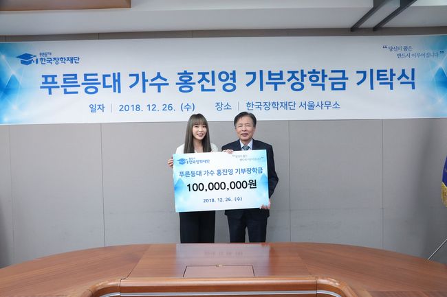 홍진영은 어려운 환경 속에서도 꿈을 가지고 학업을 이어가는 대학생들의 생활비 등을 지원하기 위해 한국장학재단에 1억 원의 장학금을 선뜻 기부했다.
