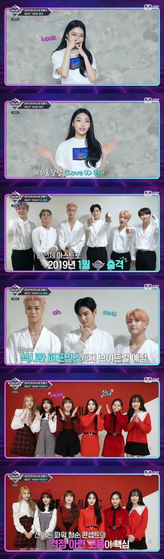 두번째 주자 아스트로는 "엠카 위시리스트를 책임질 완전체 아스트로다. 2019년 1월 엠카 출격"이라며 소리쳤다. "더욱 청량해진 아스트로의 분위기, 섹시한 아스트로의 퍼포먼스, 1월에 찾아올 아스트로를 기다려달라"고 말했다.