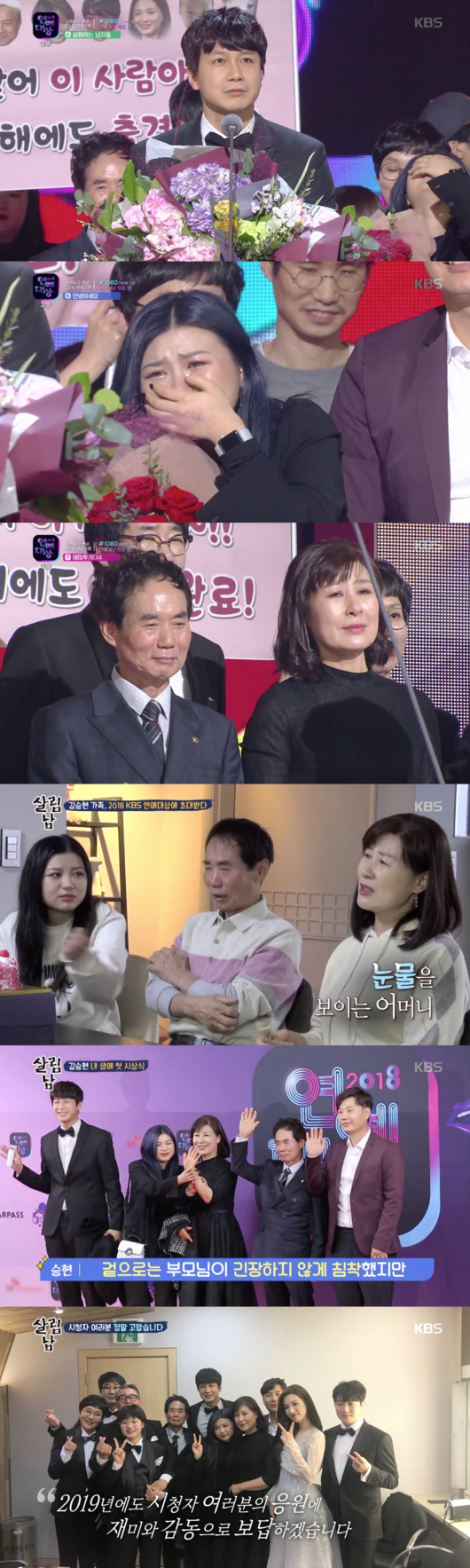 앞서 김승현은 지난 22일 열린 ‘2018 KBS 연예대상’에 ‘살림하는 남자들2’로 버라이어티 부문 우수상을 수상했다. 부모님은 베스트 커플상을 수상하며 온 가족이 수상의 기쁨을 맛봤다. 딸 수빈 양과 김승현의 어머니인 백옥자 씨는 감격의 눈물을 보이기도 했다.