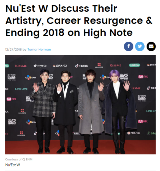 미국 음악 전문 매체 빌보드는 지난 27일(현지 시각) “Nu'Est W Discuss Their Artistry, Career Resurgence & Ending 2018 on High Note(NU’EST W 그들의 음악성, 커리어, 그리고 2018년 마무리에 대해 이야기하다)”라는 제목의 인터뷰를 전격 공개하며 뉴이스트 W의 음악성에 대한 높은 관심을 드러낸 것은 물론 다양한 주제와 함께 한 해를 돌아보는 심도 깊은 인터뷰를 나눴다.