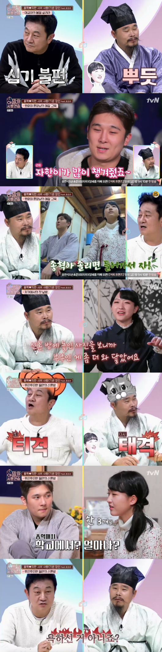 박종혁은 아내의 과거 연애사를 물었다. 김봉곤은 “뭐 저런 걸 물어봐 사내놈이”라며 화를 냈다. 스튜디오에서 같이 지켜보던 박준규도 “왜 남의 아들한테 새끼라고 하냐”고 맞섰다. 두 사람은 각자의 아들 딸을 변호하며 목소리를 높였다. 톰과 제리 같은 사돈지간이었다.