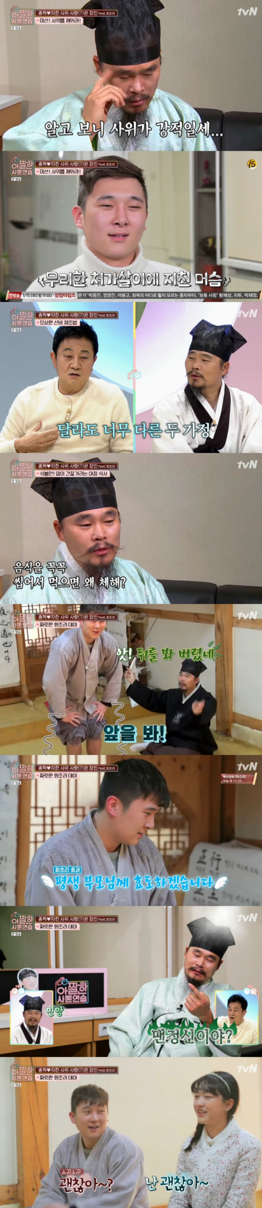 28일 오후 방송된 tvN ‘아찔한 사돈연습’ 13화에서 박준규의 아들 박종혁과 김봉곤의 딸 김자한이 동갑내기 신혼부부로 거듭났다. 박종혁은 처음 간 처가에서 종일 머슴처럼 일하며 새로운 환경을 경험했다. 지켜보던 박준규의 속은 부글부글 끓기만.