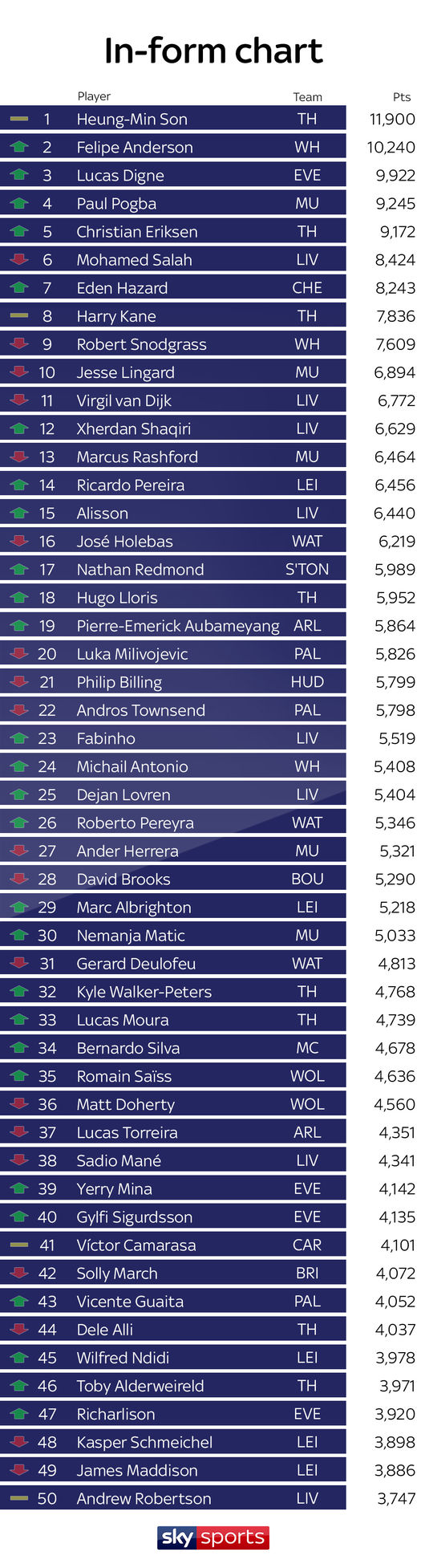 손흥민은 1만 1900점을 기록, 웨스트햄의 펠리페 앤더슨(1만 240점)과 에버튼의 루카스 디그네(9922점)를 제치고 EPL 최정상에 섰다. 폴 포그바(9245점)가 4위로 뛰어올랐다.