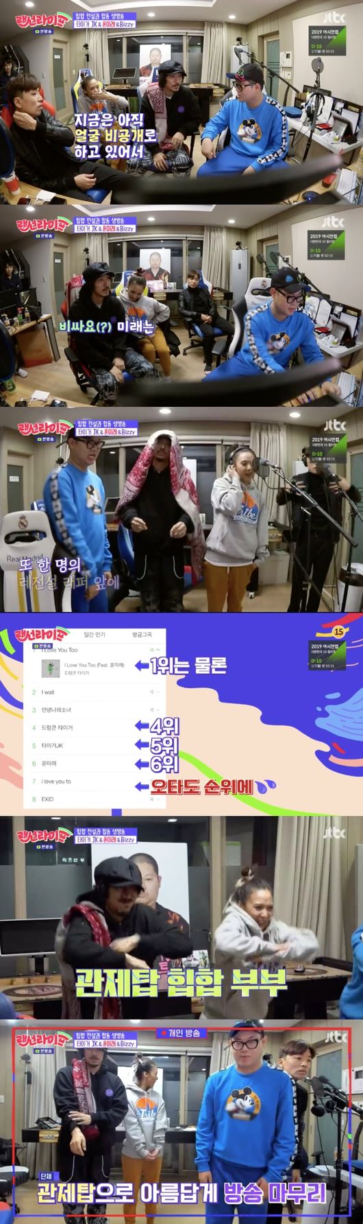 이날 방송은 시청자들의 높은 관심을 받았고 실시간 검색어 1위, 4위~7위로 이어졌다. 윤미래와 비지, 타이거 JK는 즐거움이 가득 찬 미소를 지었다./purplish@osen.co.kr