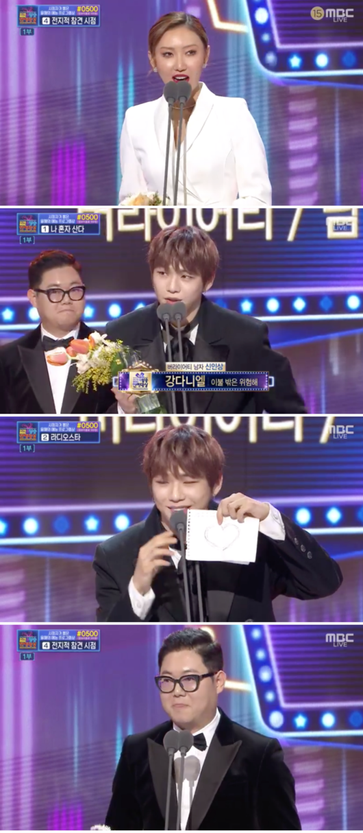 29일 오후 상암 MBC 공개홀에서 ‘2018 MBC 방송연예대상’이 열린 가운데 ‘나혼자 산다’ 화사와 ‘진짜사나이300’ 감스트, ‘이불밖은 위험해’ 강다니엘이 버라이어티 부문 신인상을 받았다.