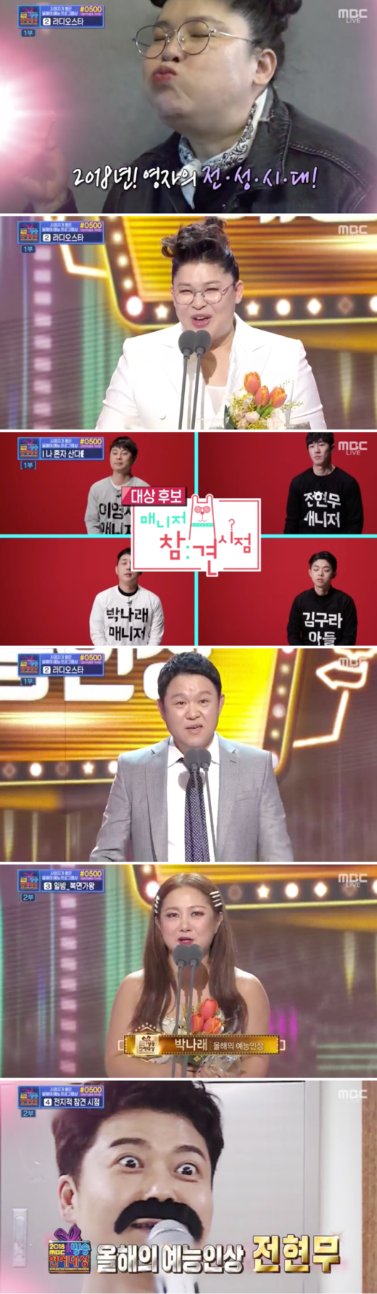 29일 오후 8시 50분, 상암 MBC 공개홀에서 MC 전현무, 혜리, 승리의 진행으로 ‘2018 MBC 방송연예대상’이 진행됐다. 올 한 해 안방 시청자들의 웃음보를 책임진 MBC 예능인들이 모두 나와 연말 잔치를 즐겼다. 대상후보는 ‘복면가왕’, ‘선을 넘는 녀석들’, ‘토크 노마드’, ‘라디오 스타’의 김구라, ‘나혼자 산다’의 박나래, ‘나혼자 산다’, ‘전지적 참견 시점’, ‘뜻밖의 Q’의 전현무, ‘전지적 참견 시점’의 이영자가 선의의 경쟁을 펼쳤다.