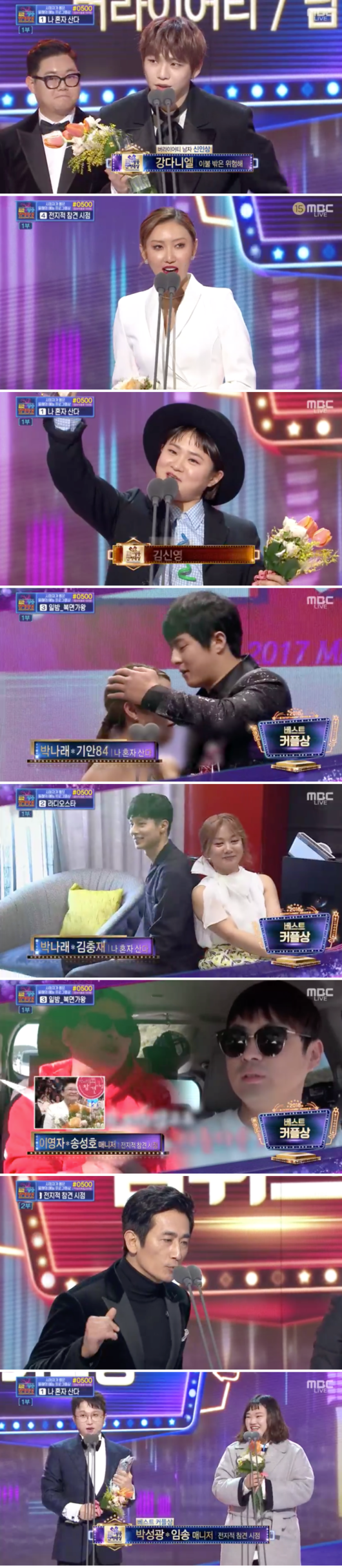 ‘올해의 프로그램상’은 '나혼자 산다'가 '전지적 참견 시점'을 제치고 트로피를 들었다. ‘올해의 팀워크상’은 ‘궁민남편’ 팀이 따냈다. 차인표는 예능인 신고식으로 랩 수상소감을 펼쳐 기립박수를 받았다. 권오중은 이에 맞춰 즉석 댄스를 춰 호응을 이끌었다.