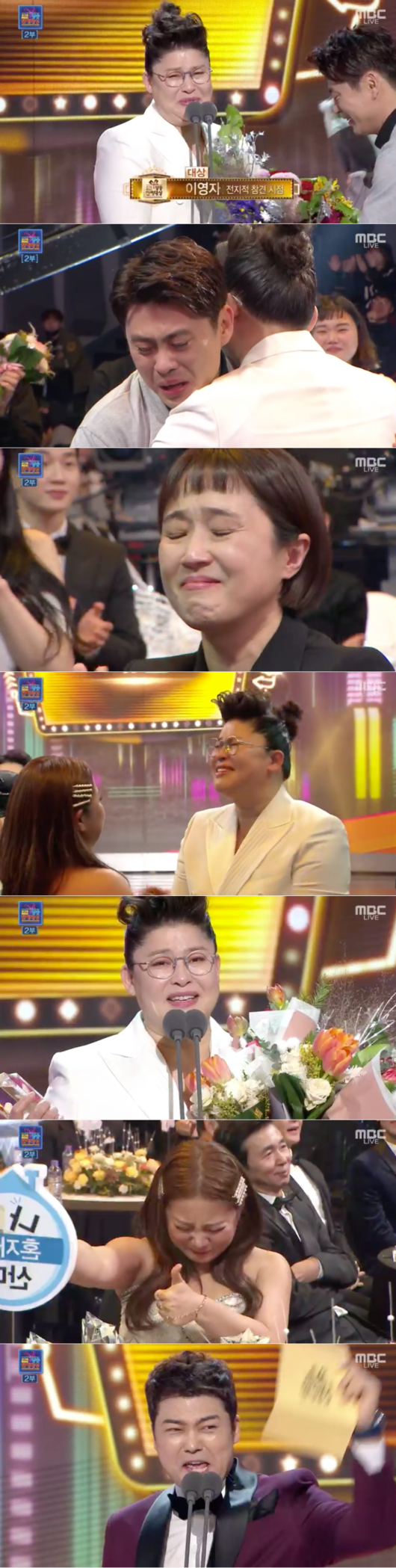 이들 중 이영자가 대상 프로피를 들어올랐다. 대상에 호명된 그는 '전지적 참견 시점'을 함께하고 있는 동료들과 뜨겁게 포옹했다. 특히 매니저 송성호 팀장과는 눈물을 펑펑 쏟으며 오랫동안 포옹했다. 끝까지 접전을 펼친 박나래 역시 대선배를 향해 눈물로 축하의 박수를 보냈다.
