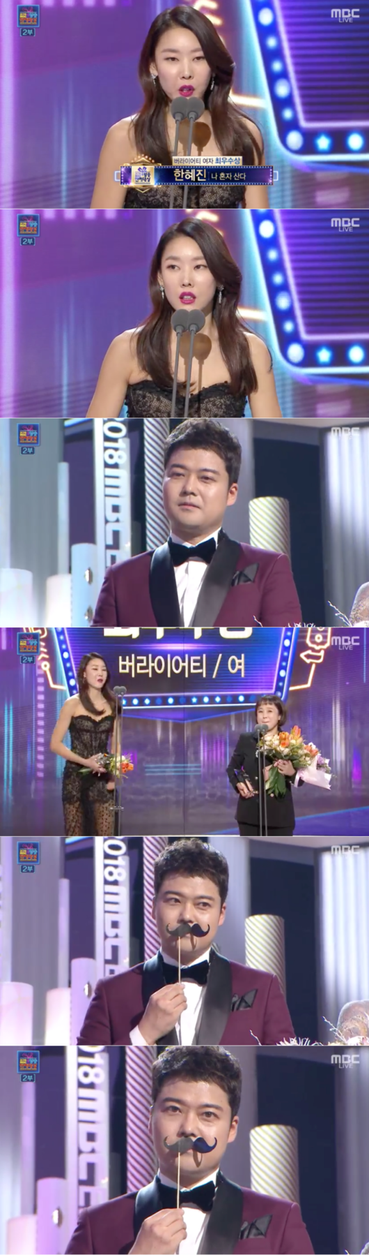 한혜진은 “정말 존경하는 송은이 선배님 축하드린다. 제가 감히 어떻게 송은이와 같은 무대에 서서 상을 받을 수 있는지 감개무량하다”며 “제작진, 출연진, 부족한 저희를 애정으로 지켜봐 주시는 시청자들 가장 감사하다. 그리고 제가 고민 많을 때 제 고충 들어주는 전현무와 기쁨 함께하고 싶다. 감사하다”고 소감을 말했다.