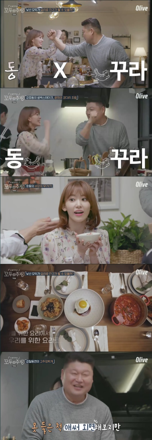 지난 29일 오후 6시 첫 방송된 올리브 '모두의 주방'에서는 강호동, 광희, 이청아, 곽동연, 미야와키 사쿠라 등 5명의 멤버가 직접 요리를 만들고 나눠 먹으면서 허심탄회한 얘기를 나눴다. 이 과정에서 소소하지만 힐링이 되는 재미를 선사했다.