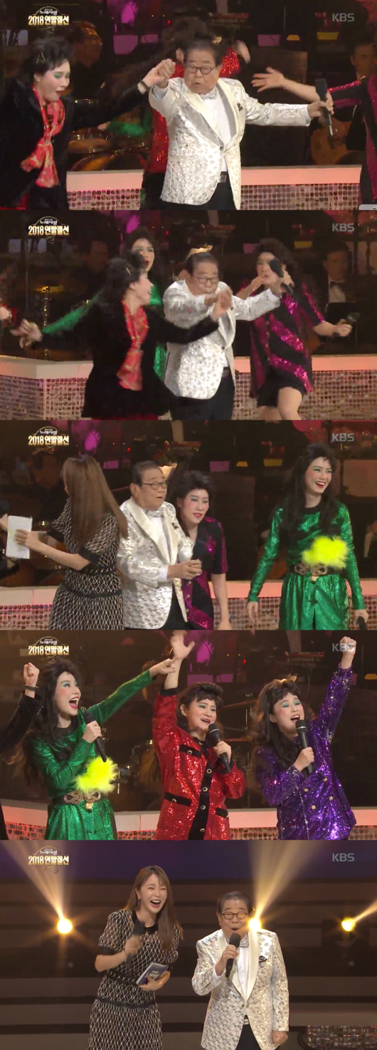 이어 "전국, 노래자랑"을 외친 후에는 MC를 맡은 송해와 홍진영이 무대 위에 올랐다. 송해와 셀럽파이브는 함께 춤을 추며 흥겨운 연말결산의 시작을 알렸다.