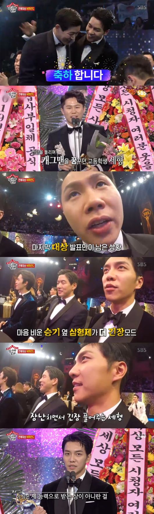 먼저 연예대상 비하인드가 그려졌다. 신인상부문에 이상윤이 상을 타자, 양세형이 너무 흥분해 바지가 터진 모습이 웃음을 안겼다. 상윤은 "새로운 도전을 함께해준 세 형제에게 감사하다"고 했고, 우수상을 받은 육성재는 시그니처 포즈를 전했다. 양세형은 최우수상을 수상했다. 전단을 돌리며 개그의 꿈을 키운 양세형은 그때를 떠올리며 진심으로 감사의 말을 전했다. 마지막 대상의 순간, 상윤도 긴장했다. 마음을 비운 이승기는 긴장된 모습을 보였다. 양세형이 카메라로 장난치며 긴장을 풀어줬다. 그러면서도 양세형도 긴장된 모습을 보였다. 승기 이름이 호명되는 순간, 상승형제들이 서로를 감싸안으며 눈물 흘렸다. 양세형은 본인 상 받을 때보다 더 감격하며 눈물을 글썽였다.
