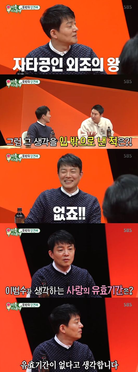 이범수는 "아내가 사소한 부탁을 할 때, 거리가 더 가까우면 좀 불만, 하지만 입밖으로 낸 적은 없다"고 말했다. 이에 공식 질문인 사랑의 유효기간을 묻자, 이범수는 "없다"면서 "사랑을 자동차로 비유하자면, 관리하고 아끼는 정도에 따라 얼마든지 연장가능가다, 마음 먹기 달렸다"며 사랑꾼 모습을 보였다.