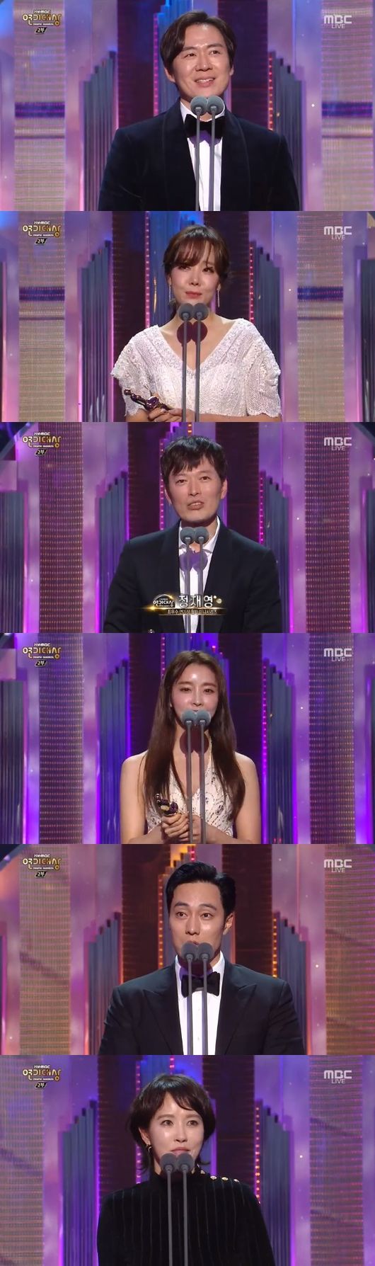 '데릴남편 오작두'로 주말특별기획 우수상을 받은 정상훈은 "MBC 드라마를 쭉 지켜봐왔는데, 드디어 상을 받았다. 지금 사랑하는 연기를 하고 있는데, 상도 받고 돈도 벌고 있어서 시청자 여러분께 책임감을 느끼고 자만하지 않고 노력하는 배우가 되도록 하겠다. TV를 보고 있는 우리 아내, 아이들에게도 감사하다"고 했다.
