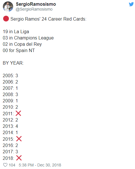 '카드의 화신' 세르히오 라모스도 2018년에는 단 한 장의 레드카드도 받지 않았다. 라모스는 선수 커리어 내내 24장의 레드카드를 받았지만, 올해는 한 장도 받지 않았다.