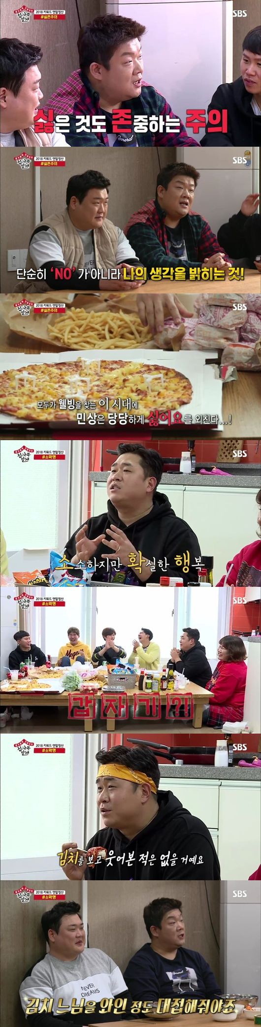 마지막 문세윤의 키워드는 '소소하지만 확실한 행복'이란 뜻의 '소확행'이었다. 문세윤은 소확행을 느끼게해줄 음식으로 김치를 가져왔다. 문세윤은 "냉장고에 항상 있다. 그런데 우리는 김치에게 고마워하지 않는다. 소중하지만 아주 확실한 맛. 우리는 잊고 살았다"고 김치의 소중함에 대한 열변으로 ‘김치부흥회’를 만들어 웃음을 안겼다. 문세윤의 먹팁에 이어 "음식을 위해 따로 냉장고가 있는 것은 김치와 와인뿐이다. 김치도 와인 정도로 취급해 줘야 한다"는 먹사부들의 ‘먹언’이 터져나온 이 장면은 12.3%로 이 날 ‘최고의 1분’을 차지해 눈길을 끌었다. /parkjy@osen.co.kr