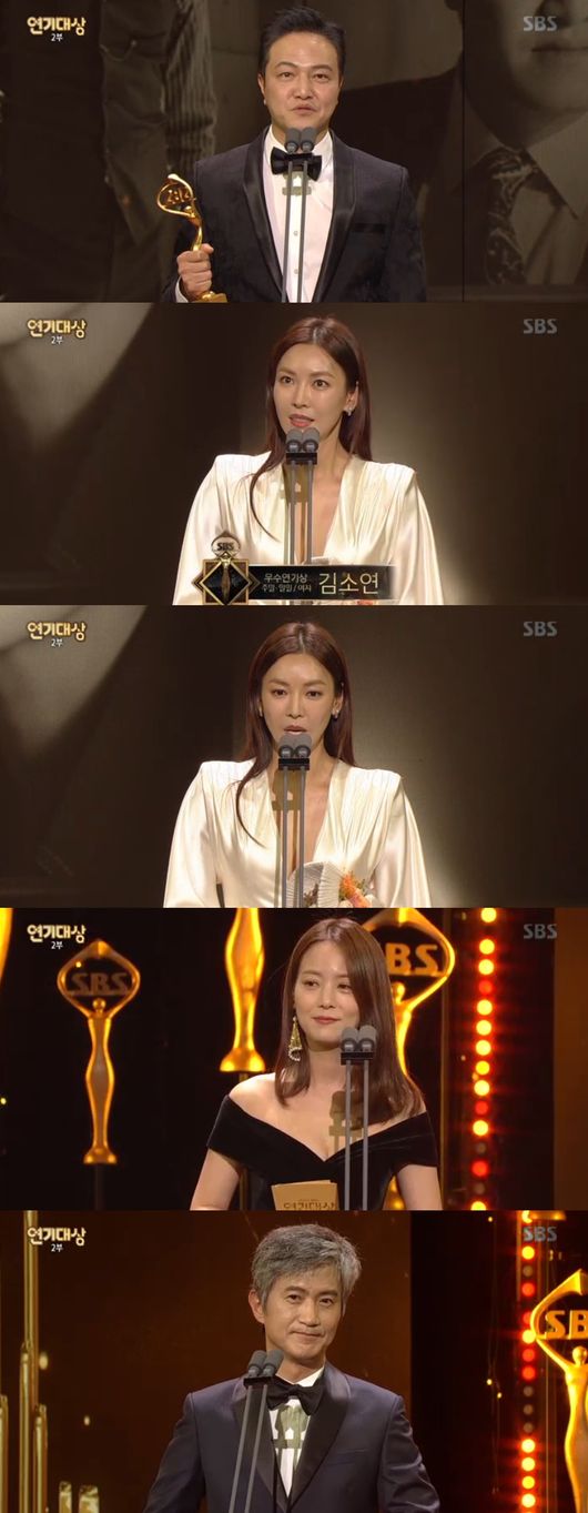 '우수연기상' 주말 일일드라마 부문 여자후보로는 '시크릿 마더'의 김소연, '해피시스터즈'의 심이영, '착한 마녀전'의 윤세아, '그녀로 말할 것 같으면'의 한다감이 오른 가운데, 김소연이 수상했다. 김소연은 "처음 캐스팅 됐을 때 환호성 지른 순간이 생각난다"면서 감격, 이어 "현장에서 힘이 되준 스텝들, 소속사 식구들, 팬들 감사하다, K 본부에서 어색하고 있을, 응원이 많이 되어준 이상우씨 고맙다"며 남편 이상우를 향한 사랑도 드러냈다.
