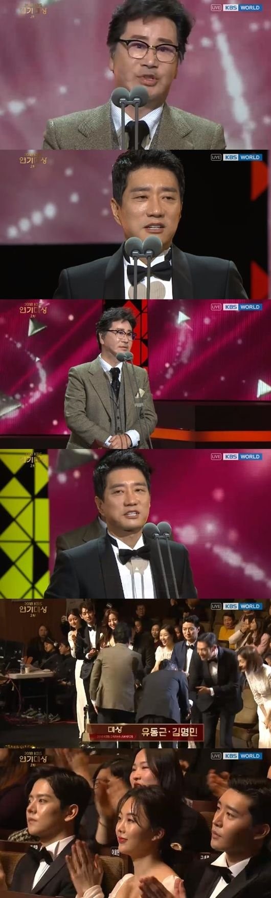 이어 유동근은 "황금돼지가 왜 제 품으로 왔는지 조금은 후회스럽기도 하다. 사실 '같이 살래요'는 장미희 씨가 있었기 때문에 가능했는데, 제가 뭐한 게 있다고. 나이가 많아서 그런진 모르지만 이걸 어떻게 감당해야 할지 잘 모르겠다"라고 겸손한 모습을 보인 뒤, "지상파에서 하나밖에 남지 않은 주말극이다. 우리 배우들은 이 방송국에 큰 사랑을 가지고 있고 시청자분들께도 감사드린다. 다만 황금돼지의 해를 맞아 올해에는 대하드라마가 제발 부활했으면 좋겠다. 전 tvN 드라마 '미스터 션샤인'의 멋진 연기도 좋았지만 그 드라마로 의병이라는 단어를 배웠다. 시청자분들이 열기와 열정과 성원을 보내주시면 대하드라마가 반드시 부활될 수 있을 거라고 믿는다. 도와달라. 살려달라"라고 남다른 수상 소감을 전해 감동을 선사했다.