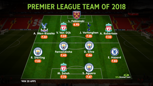 유럽축구통계업체인 후스코어드 닷컴은 1일(한국시간) 2018년 1월부터 12월까지 EPL서 20경기 이상 나와 가장 높은 평가를 받은 11명의 선수를 발표했다.